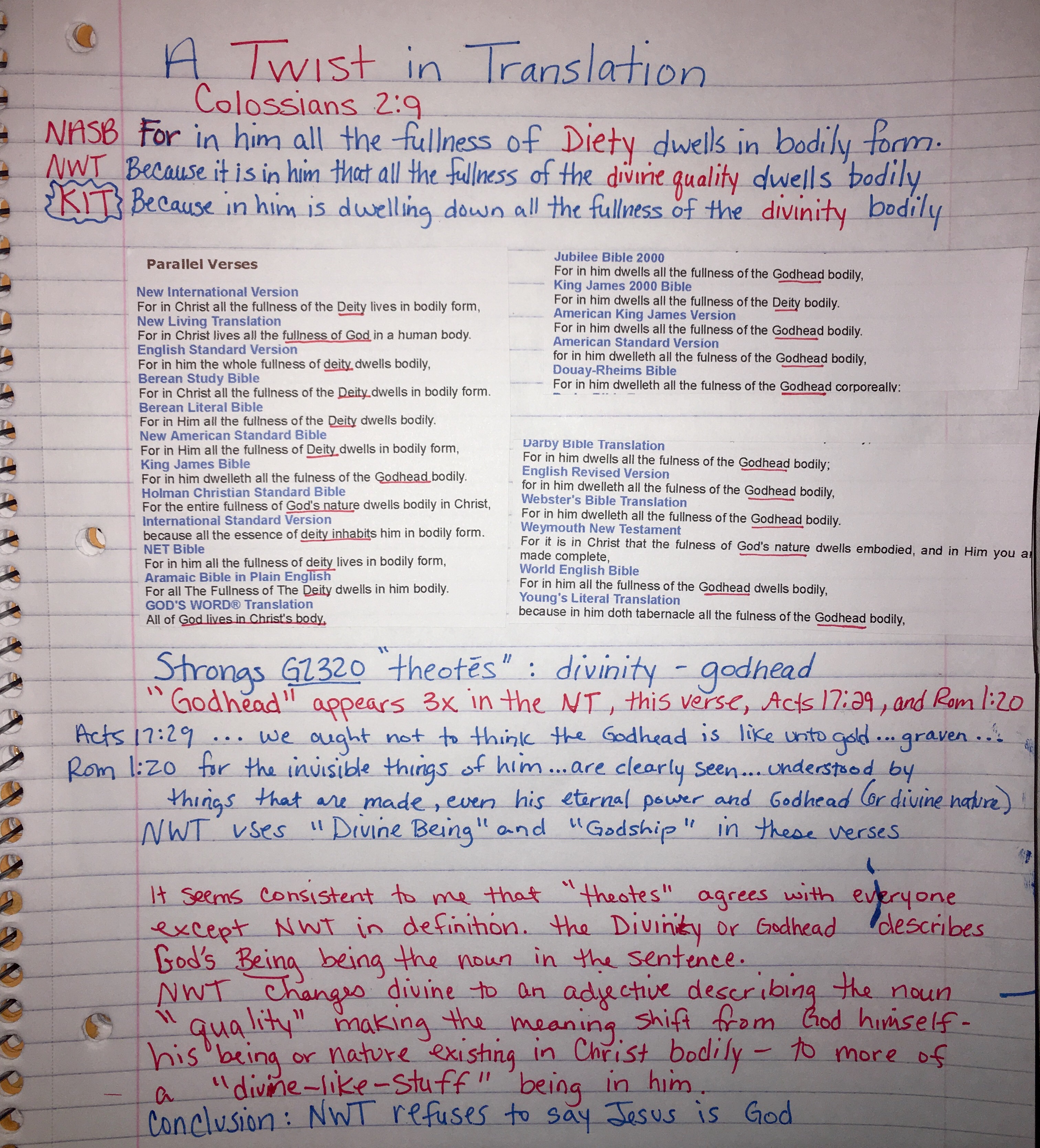 2) The second problem is Paul’s polemic here, demonstrated in the preceding word πληρωμα and the following word σωματικως. The former is a technical loan word from Gnosticism for their pantheon of deities, “the Fulness.” The latter word, σωματικως, also speaks against the Gnostics for many of them were docetic as well. They denied that Christ had a body, that he only seemed (docetic, from δοκεω, to seem) to have a physical body. So, Paul’s use of Greek terminology here represents a polemic against Gnosticism in that what he’s saying is that the totality of what it means to be a god, what the Greeks called their Pleroma, is well-met by Christ, and done so in a physical body. Anyone reading that with Greek eyes would understand that Paul was confronting the gnostic beliefs. NWT rendering undermines that, and opens the passage up to gnostic interpretation in its original context.”